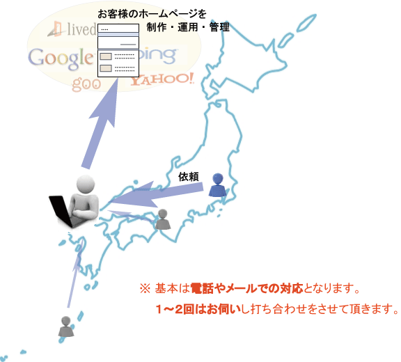 はい可能です。制作前にお客さまのお店(会社)に一度伺い、その場でサービスの詳細と、実際にどんなホームページをつくるのか?どんな特色を出していきたいのか?など実際にホームページ制作に必要となるコンテンツのヒアリングを行います。そしてその内容を自社に持ち帰り、ヒアリングの内容にそって制作をおこないます。その他の打ち合わせは電話での打ち合わせとなります。